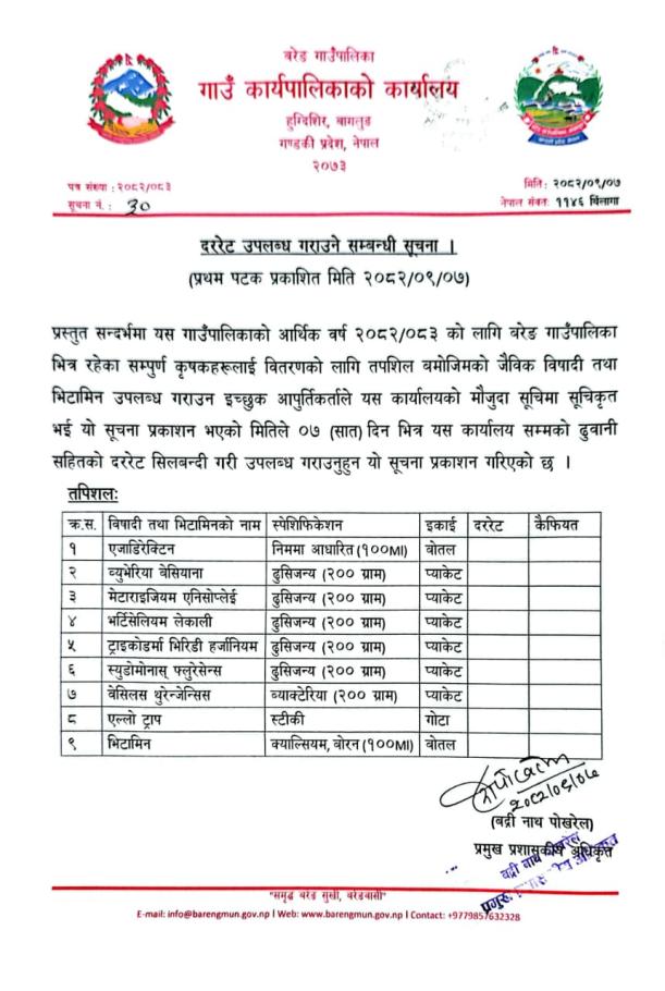 दररेट उपलब्ध गराउने सम्बन्धी सूचना(जैविक विषादी तथा भिटामिन)