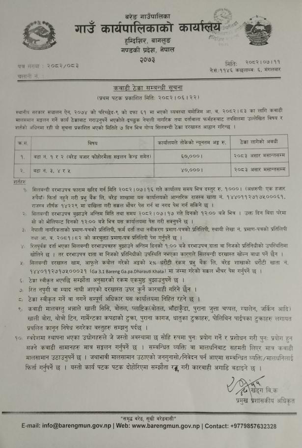 कबाडी ठेक्का सम्बन्धी सूचना (दोस्रो पटक)