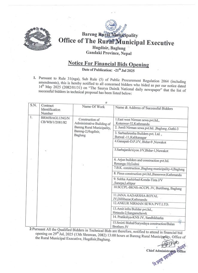 वित्तीय बोलपत्र खोल्ने सम्बन्धी सूचना