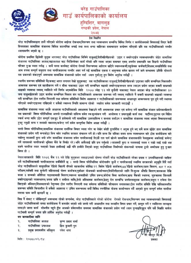 मिति २०७६।१२।१८ गते मंगलवारका दिन बरेङ गाउंपालिका अध्यक्ष श्री कृष्ण प्रसाद शर्मा ज्यूबाट अपरान्ह ५:०० बजे सामुदायिक रेडियो विहानी एफएम ८९ मेघाहर्ज द्वारा कोरोनाको जोखिम न्यूनिकरण र व्यवस्थापनका सन्दर्भमा गाउंपालिकावासीका नाममा गरिएको विशेष सम्वोधन!!!