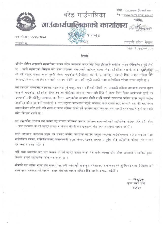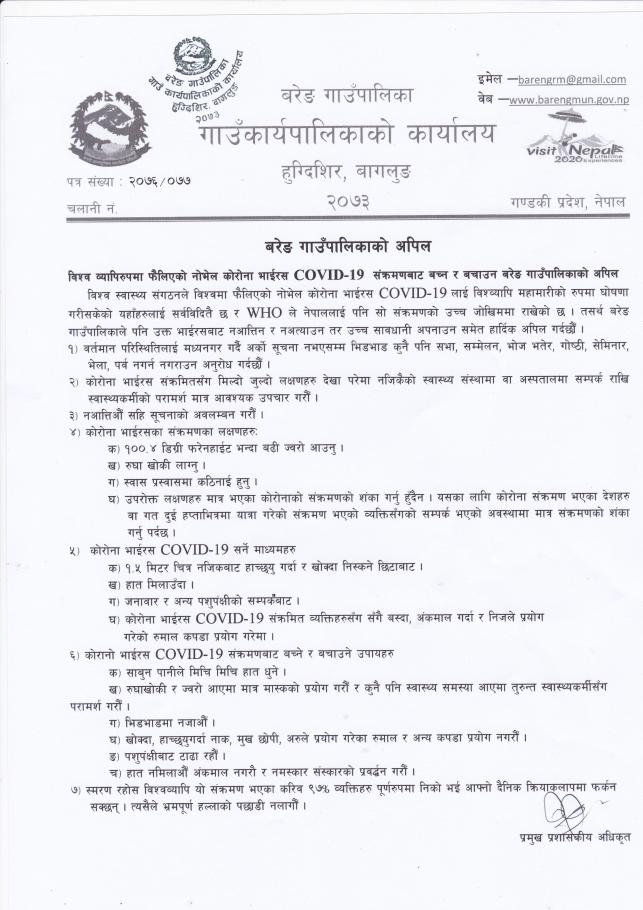 काेराेना भाइरस Covid-19 काे सन्दर्भमा बरेङ गाउंपालिकावासी जनताका लागि गाउंपालिका अध्यक्ष श्री कृष्ण प्रसाद शर्मा बाट मिति २०७६/१२/१८ गते अपरान्ह ४:०० वजे सामुदायिक रेडियाे विहानी ८९ मेघाहर्ज बाट विशेष सम्वाेधन प्रत्यक्ष प्रसारण हुने व्यहाेरा सबैको जानकारी लागि अनुराेध छ ।।।